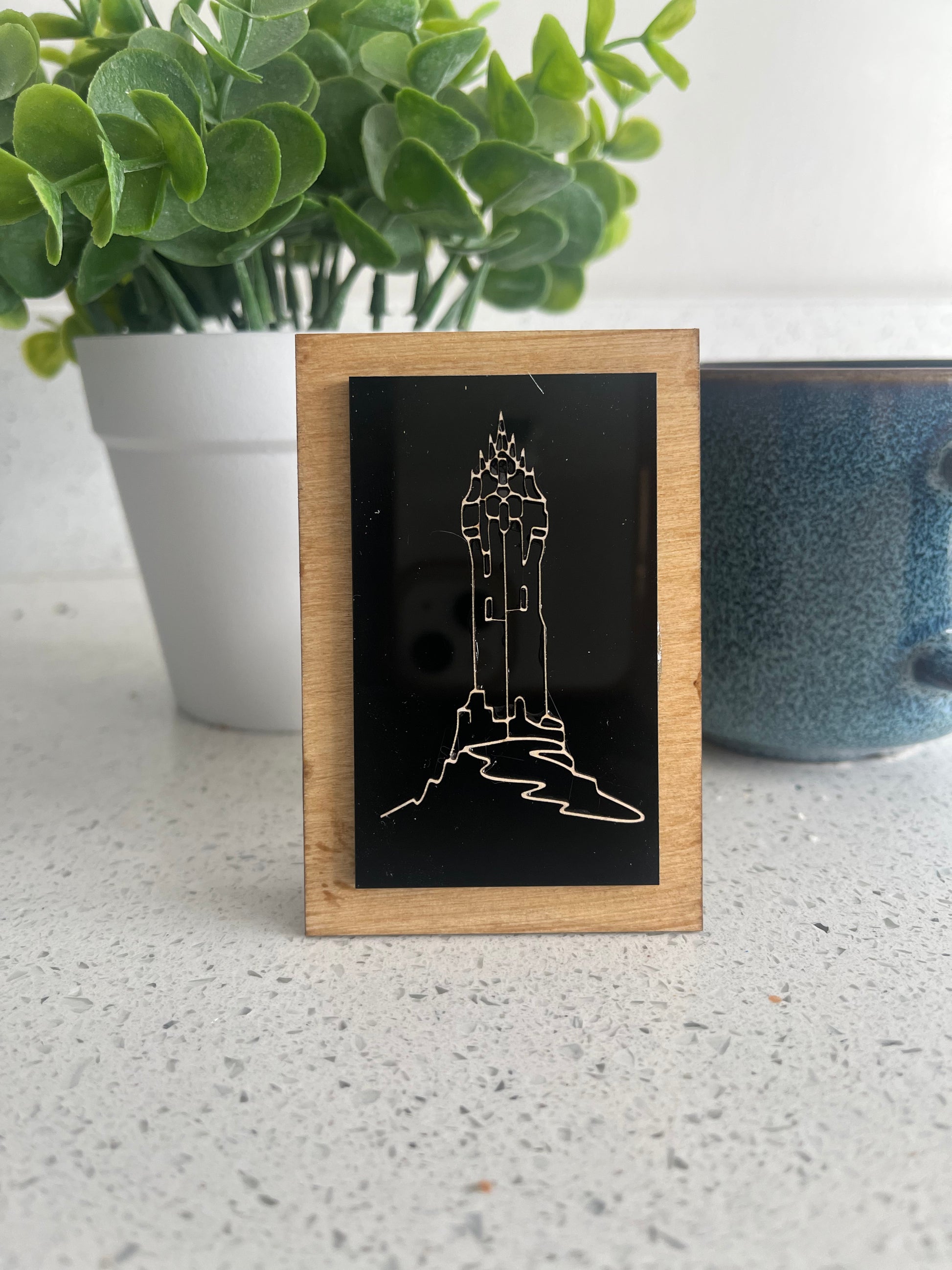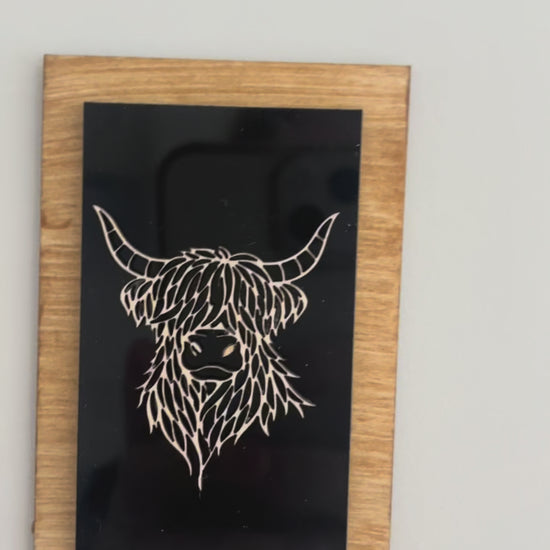 Each fridge magnet is handcrafted using a 2mm plywood base with a magnetic backing and finished with an oak stain, 3mm acrylic centre layer, and topped with a Scottish line art design laser cut from 2mm ply.